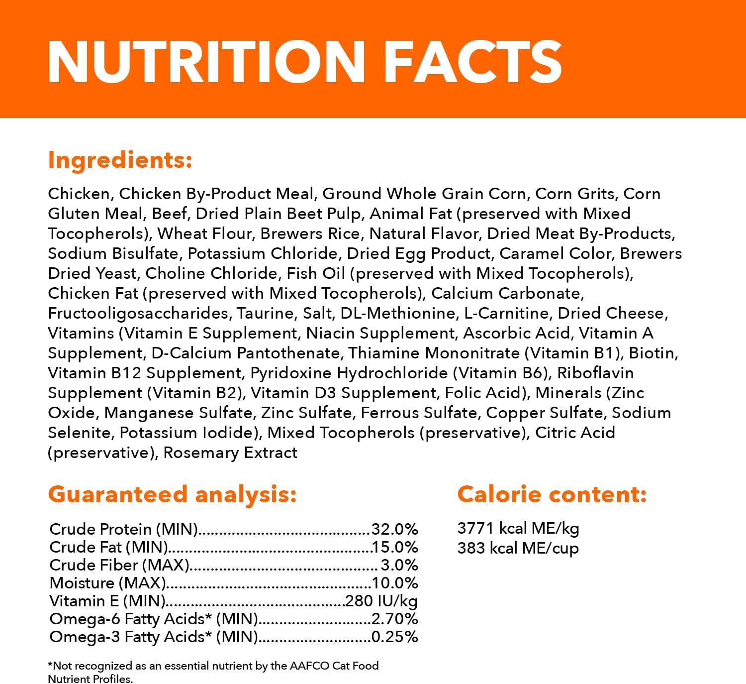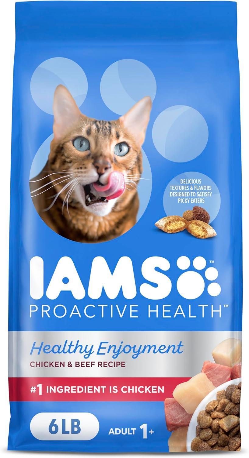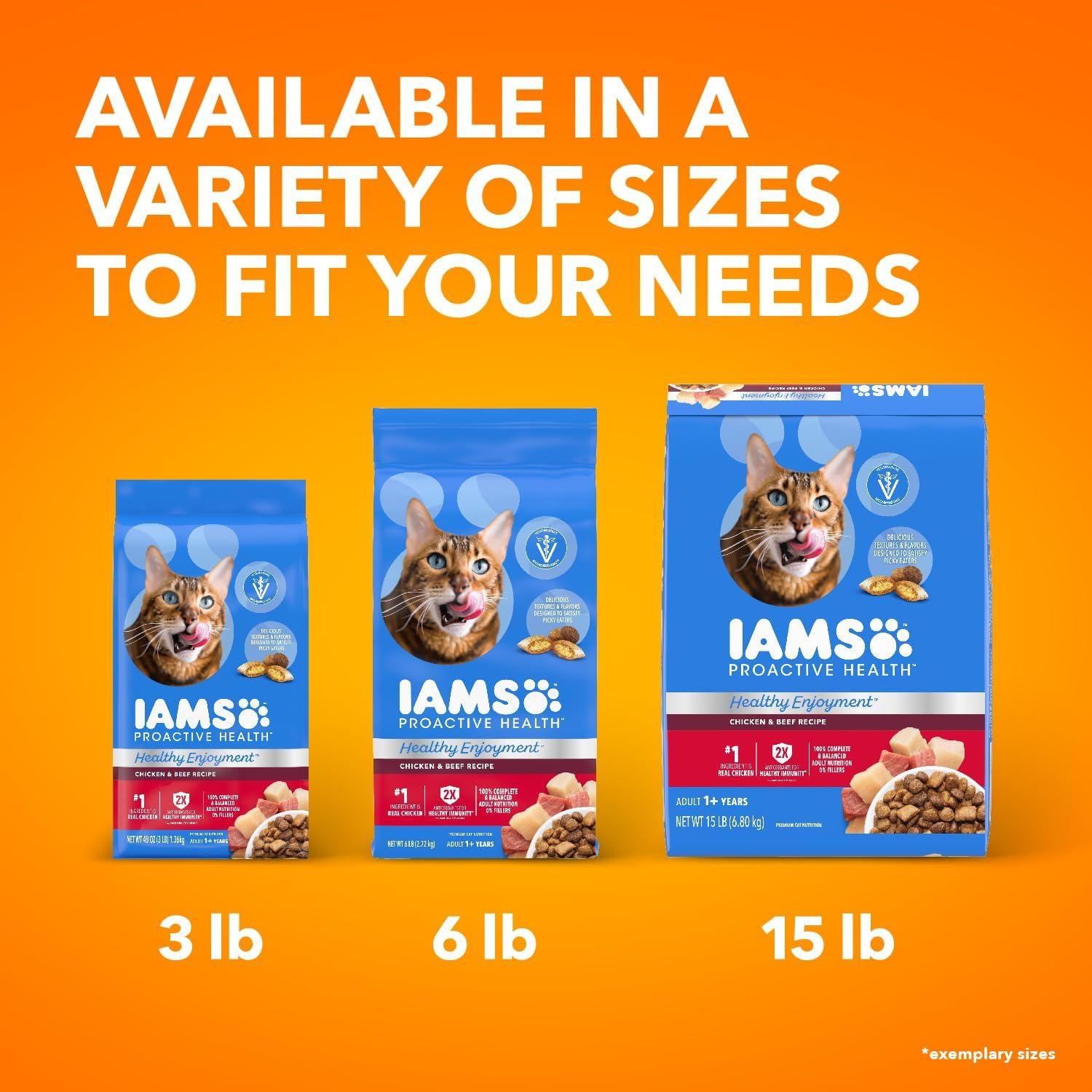 IAMS Healthy Enjoyment Dry Cat Food Chicken & Beef Recipe aims to deliver cat food for picky eaters. It’s an irresistible combination of nutrient-rich kibble with savory bites that are crunchy outside with a soft, delicious filling. Healthy Enjoyment can benefit your cat’s vibrant whole-body health with essential nutrients and antioxidants. Real chicken is the #1 ingredient in this complete and balanced adult cat food to provide a nutrient-rich kibble and tasty meal. High-quality protein helps your adult cat maintain their muscles, including a healthy heart. IAMS Healthy Enjoyment Cat Food is the ideal blend of taste and nutrition to help keep cats at their best.