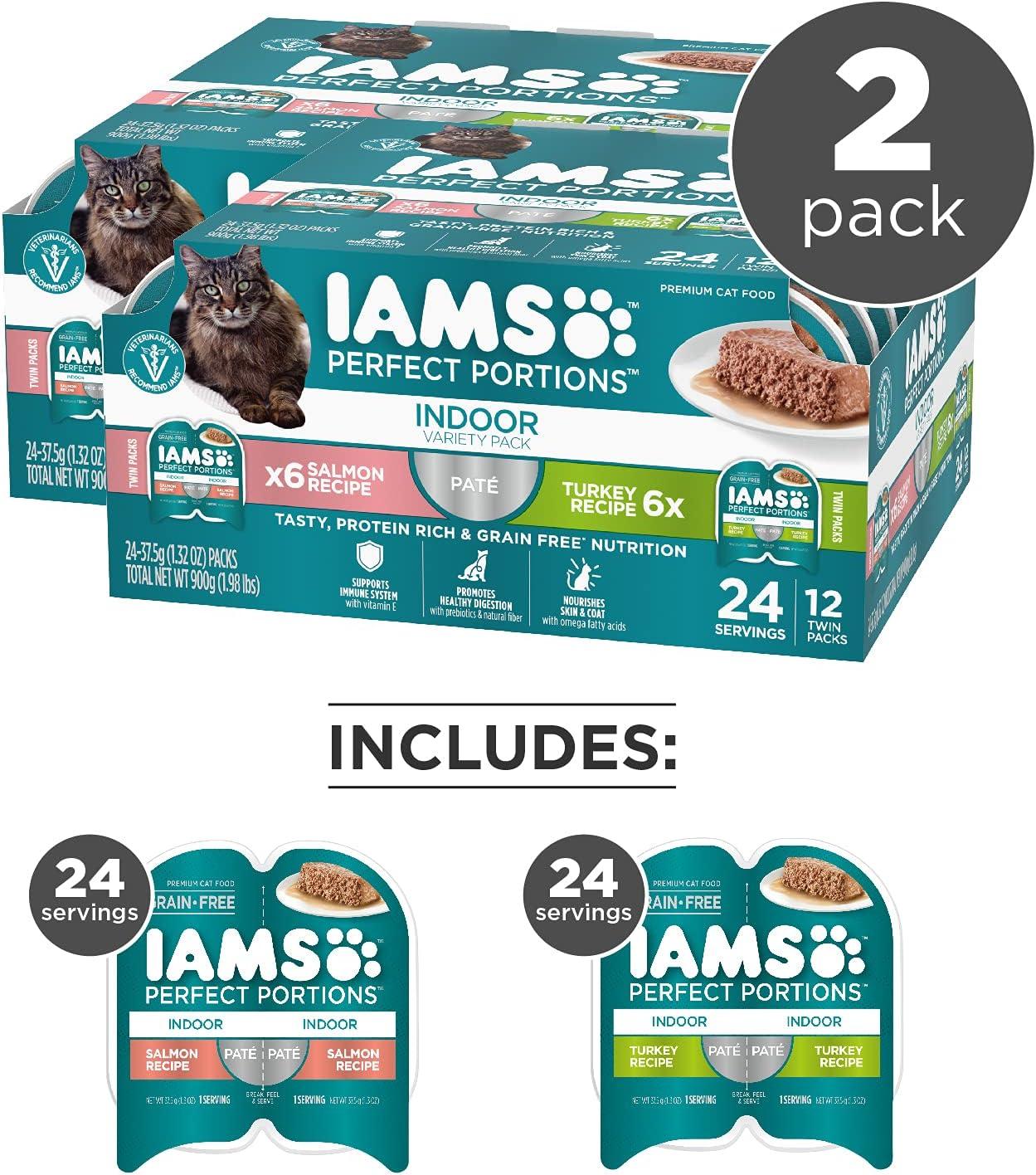 IAMS Perfect Portions Indoor Adult Grain Free Wet Cat Food Pate, Turkey and Salmon Recipe, 2.6 oz. Twin-Pack Trays (12 Count, 24 Servings) (Pack of 2)(Variety Pack)
