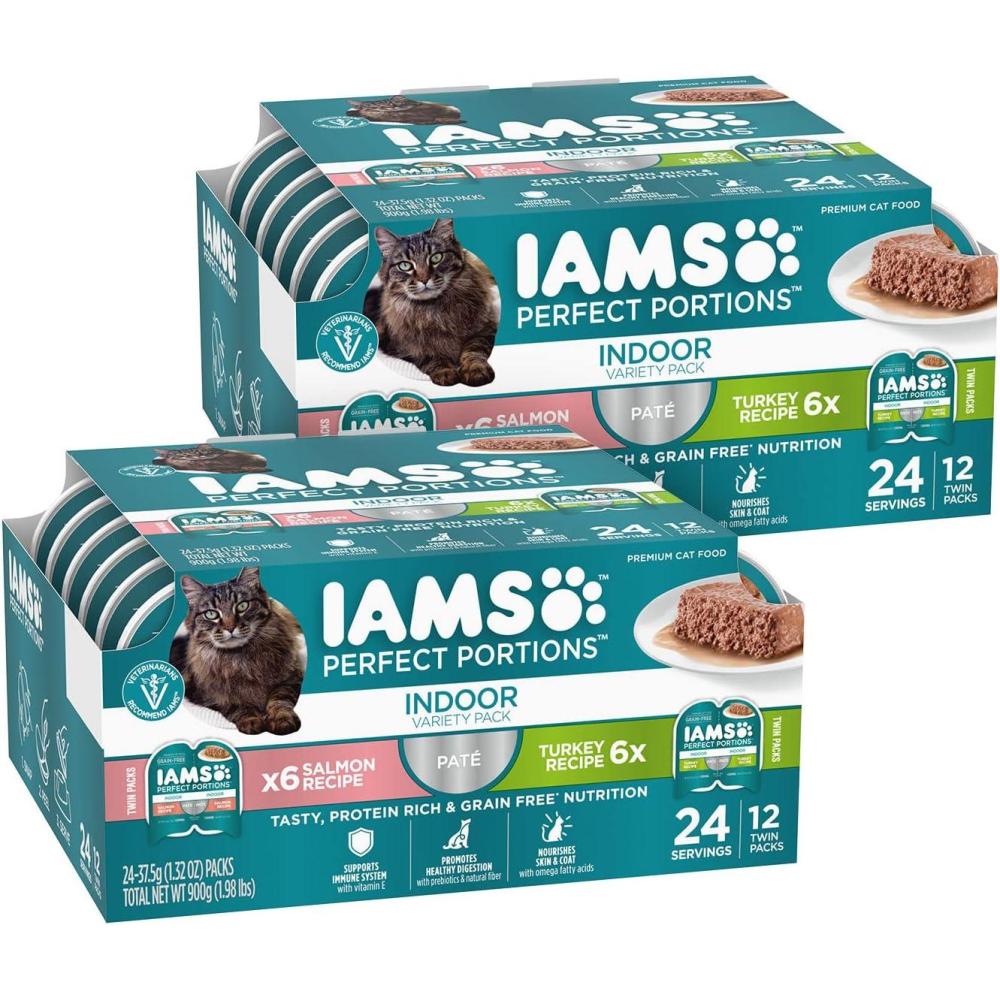 Get up to 50% off on IAMS Perfect Portions Indoor Adult Grain Free Wet Cat Food Pate, Turkey and Salmon Recipe, 2.6 oz. Twin-Pack Trays (12 Count, 24 Servings) (Pack of 2)(Variety Pack) styles during our spring sale event.